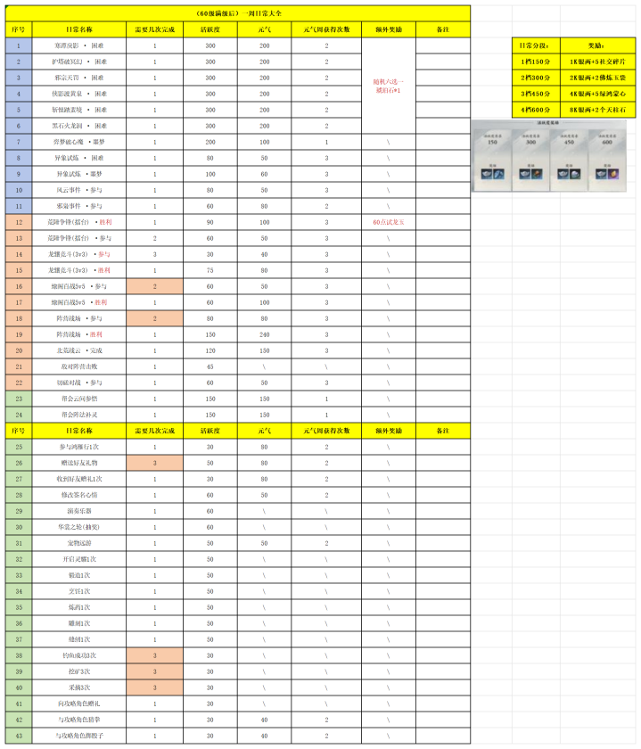 列位仙友寰球好,此次给寰球整理了这个60级满级之后的一周日常大全。家喻户晓,诛仙天下的日常分为四档,一档150分,2档300分,三档450分,4档600分。那么给到1000 2400千8000点银两,同期还有特殊的两个佛灵玉带,五个鸿蒙BC和2个天柱石。那么同期除了取得活跃度,然后获取这个银两奖励以外呢,那么还有无数的元气奖励。那咱们玩过三测的都知说念,一周的元气上限是3000点,那咱们就制定一个选藏的决策,既自满每天600分的日常活跃大全,同期又能自满一周三千点的元气上限全部拿满。